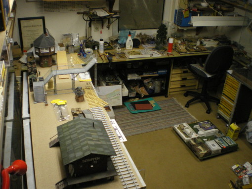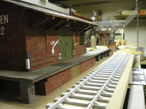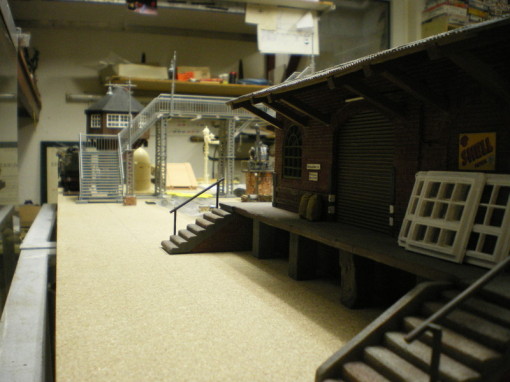 Blick auf den im Bau befindlichen letzten Teil der über 6 Meter langen Eisenbahnanlage im Maßstab 1:35 , mit Güterschuppen , Stellwerk und Fußgägerbrücke.